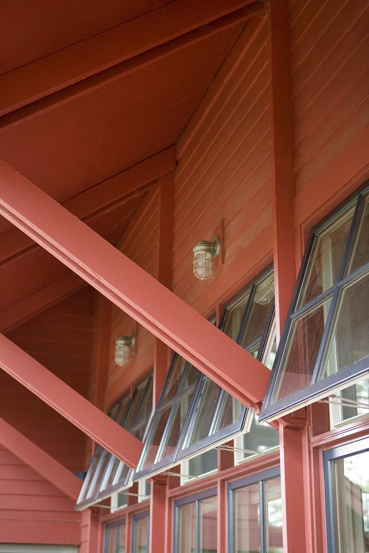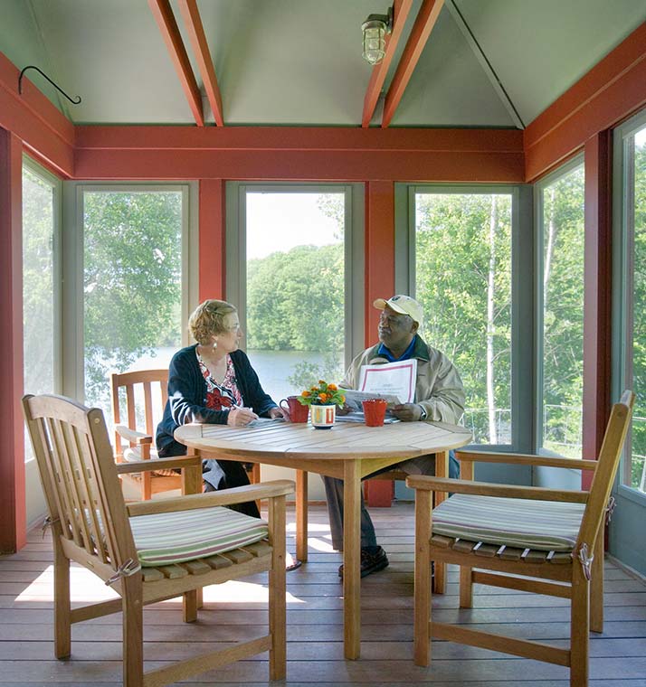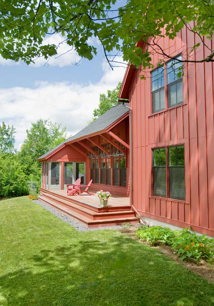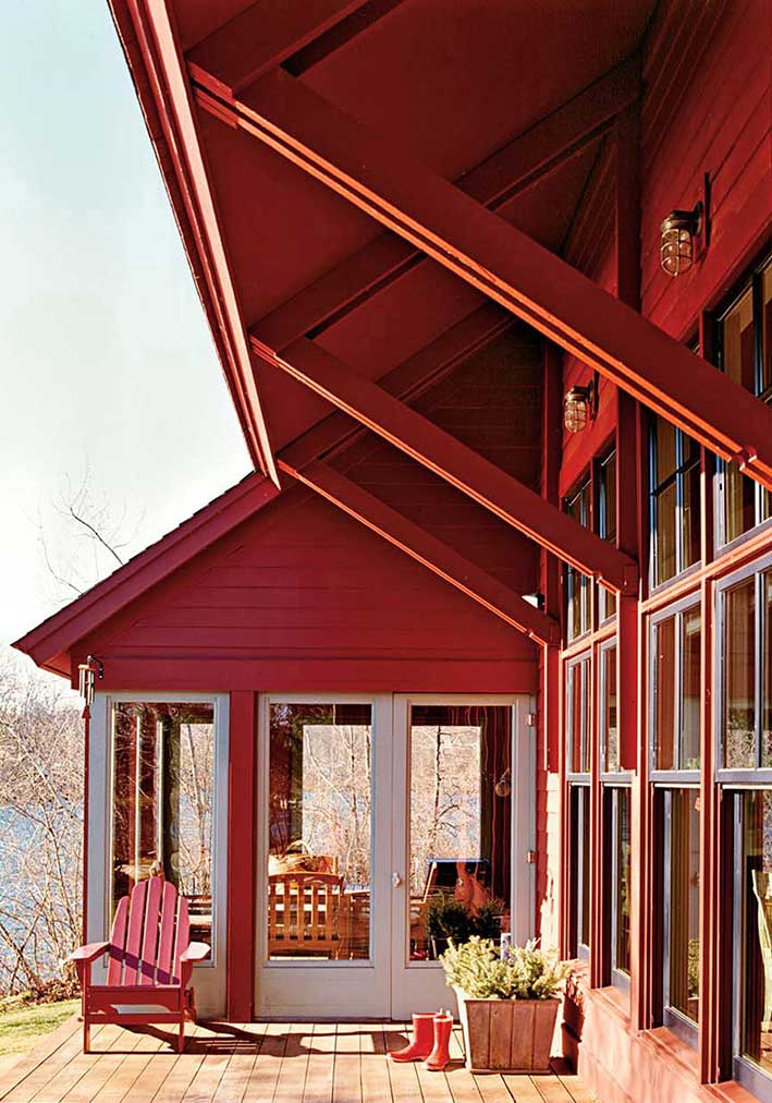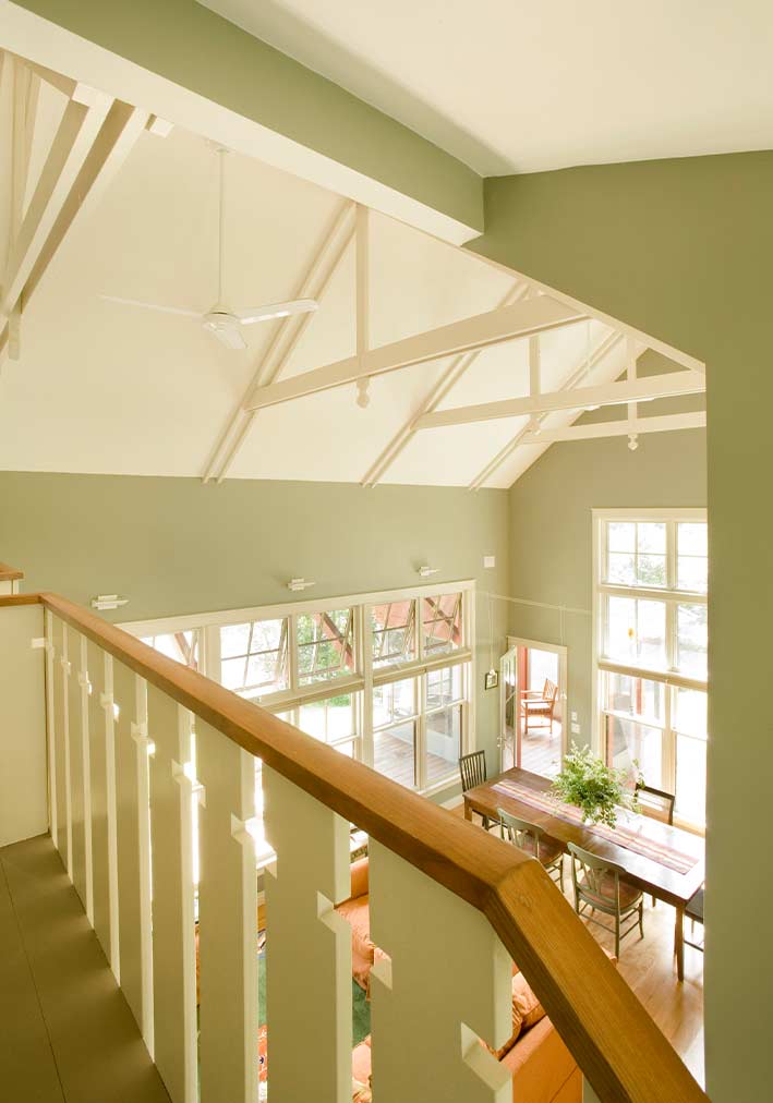Located on a reservoir in Auburn, MA, this lakeside cottage sits close to the water, occupying the site of a former fishing shack. Simple architectural details reflect the owner’s desire for a place for family and friends to gather and relax. Three bedrooms face east, and the living room, dining room, and kitchen face the water. At 26’, the ceiling of the main living space is framed with exposed king post trusses. An open porch and screened-in porch face south – both protected by an overhang that acts as a shield from the direct summer sun.