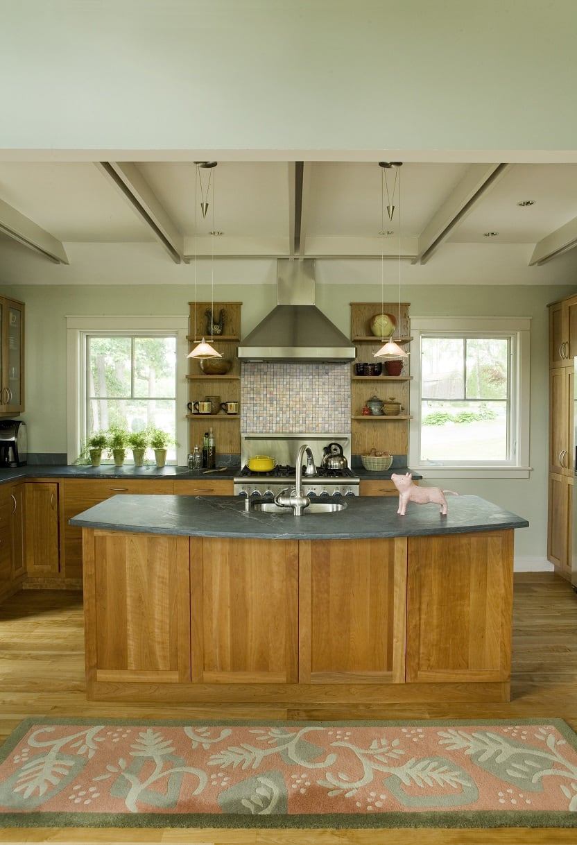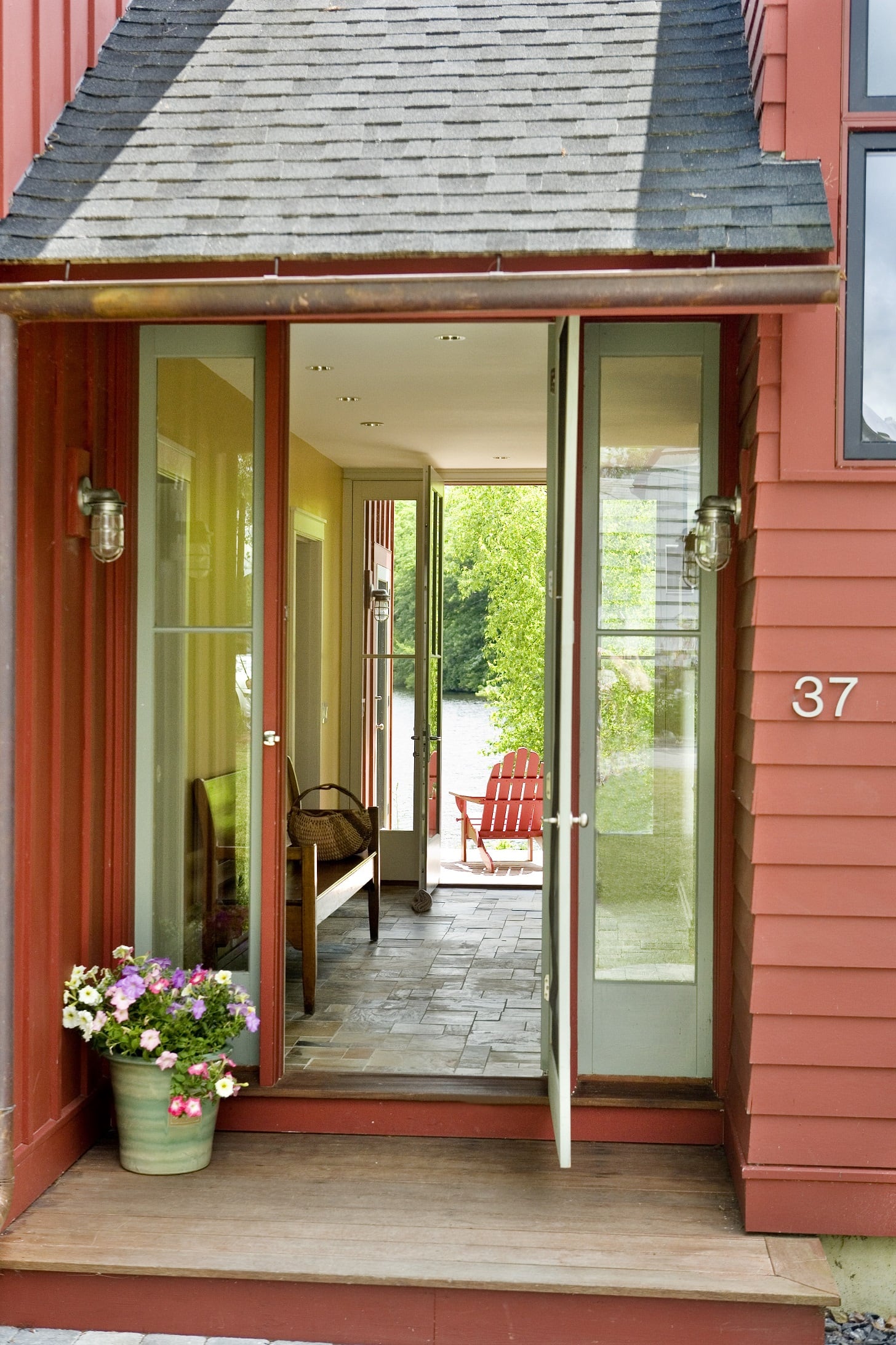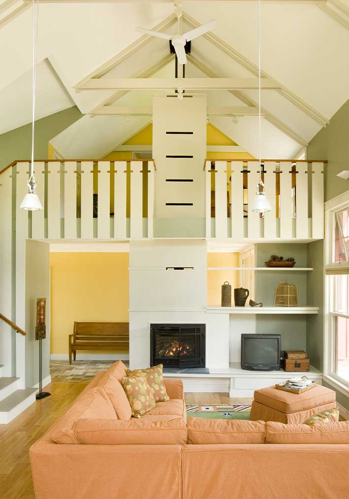 Located on a reservoir in Auburn, MA, this lakeside cottage sits close to the water, occupying the site of a former fishing shack. Simple architectural details reflect the owner’s desire for a place for family and friends to gather and relax. Three bedrooms face east, and the living room, dining room, and kitchen face the water. At 26’, the ceiling of the main living space is framed with exposed king post trusses. An open porch and screened-in porch face south – both protected by an overhang that acts as a shield from the direct summer sun.