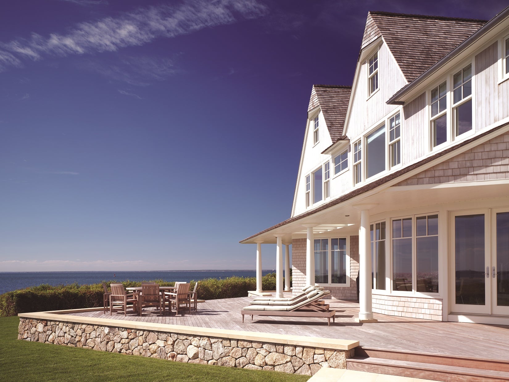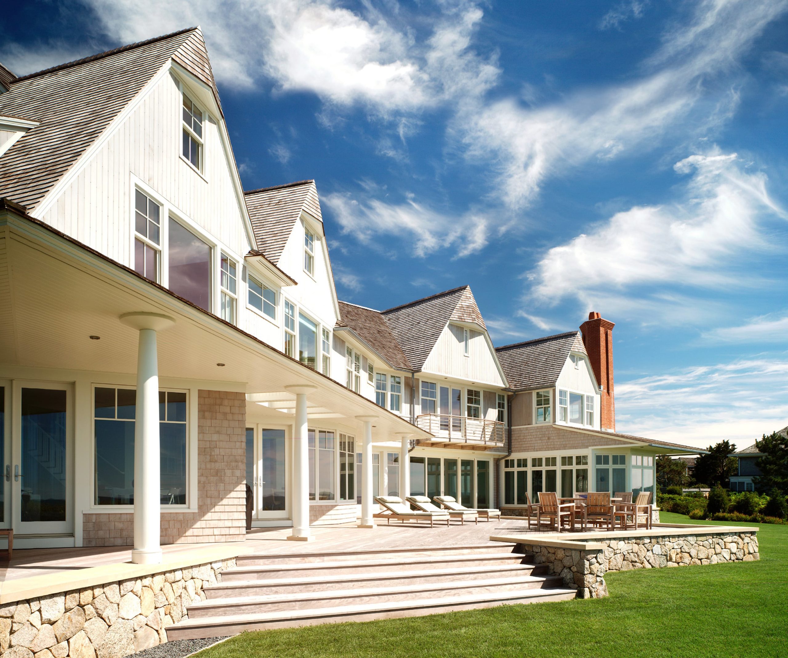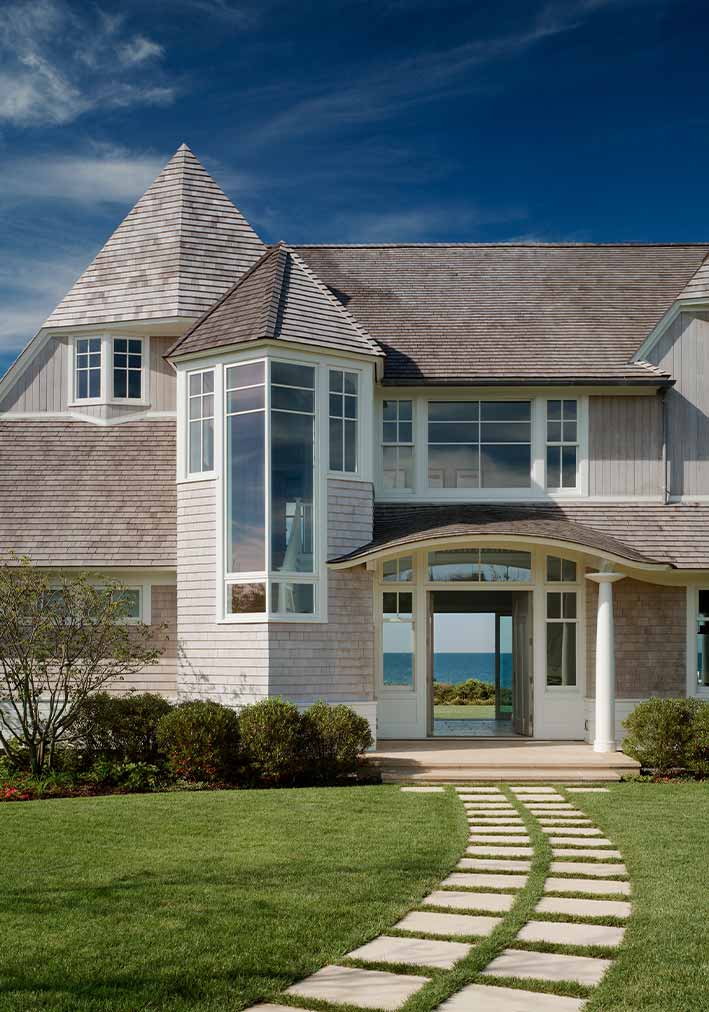 This large three-story wood-frame shingle style custom waterfront home was carefully sited to take advantage of the sweeping views of the ocean and large lot. The custom waterfront home was designed by our architects to have an open plan to allow visual connections between the separate rooms and allow for ocean views whenever possible.