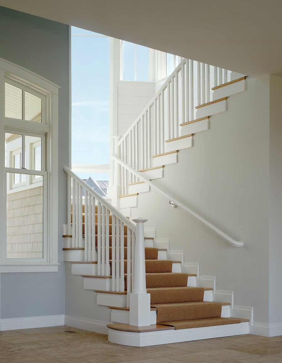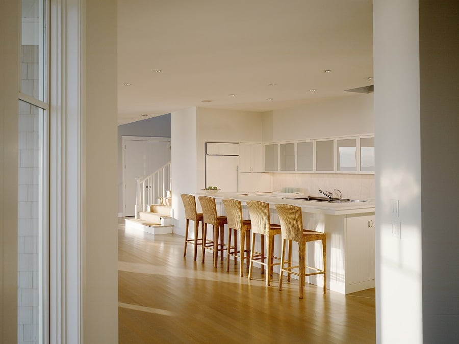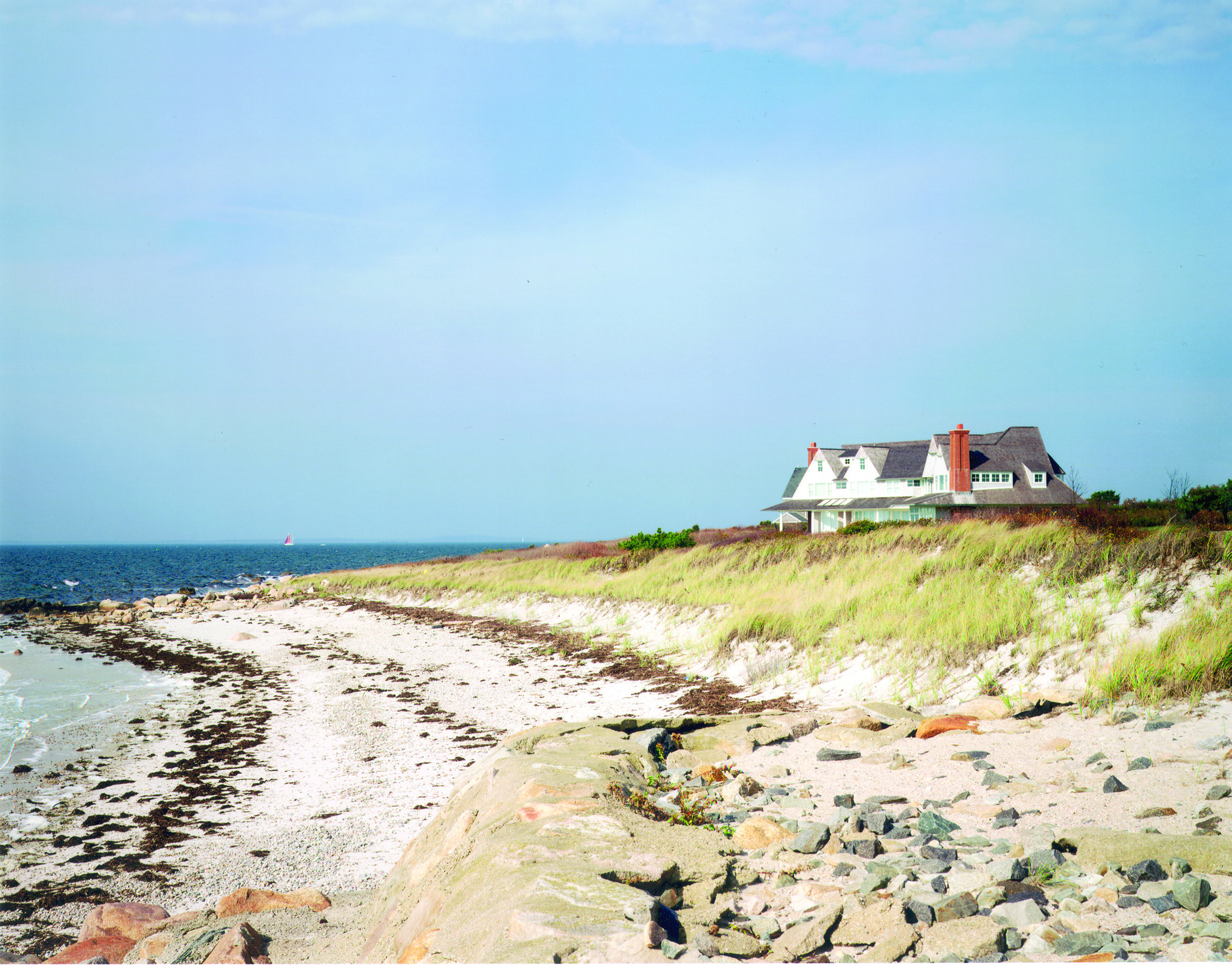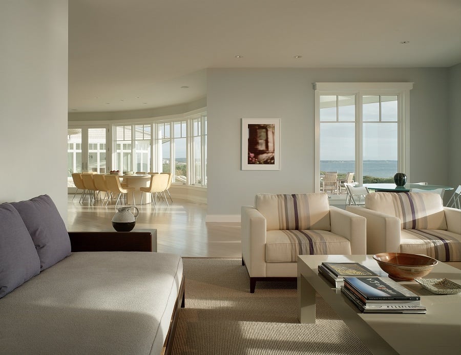 This large three-story wood-frame shingle style custom waterfront home was carefully sited to take advantage of the sweeping views of the ocean and large lot. The custom waterfront home was designed by our architects to have an open plan to allow visual connections between the separate rooms and allow for ocean views whenever possible.