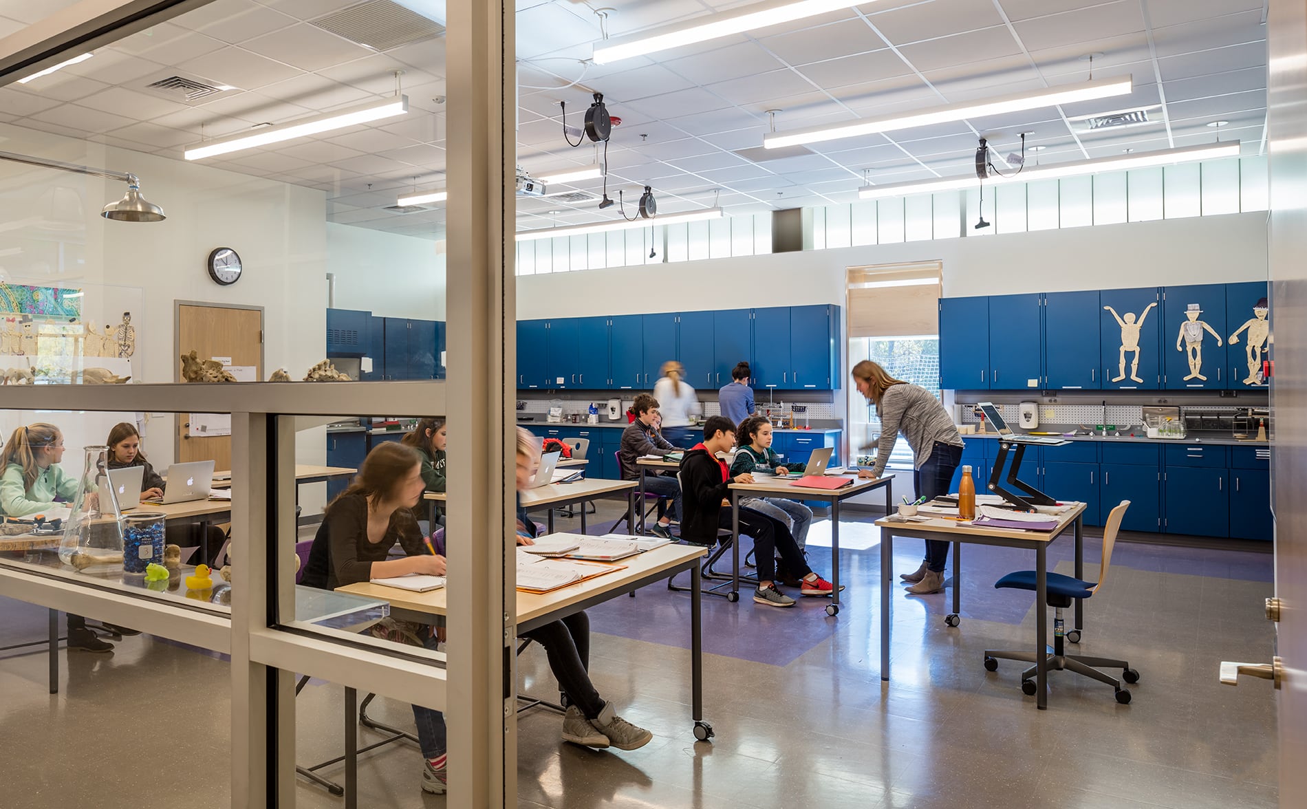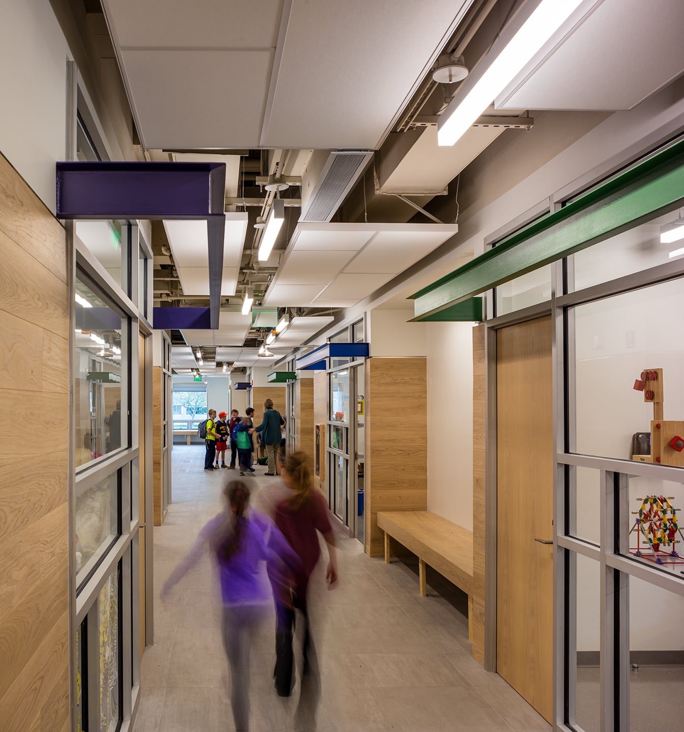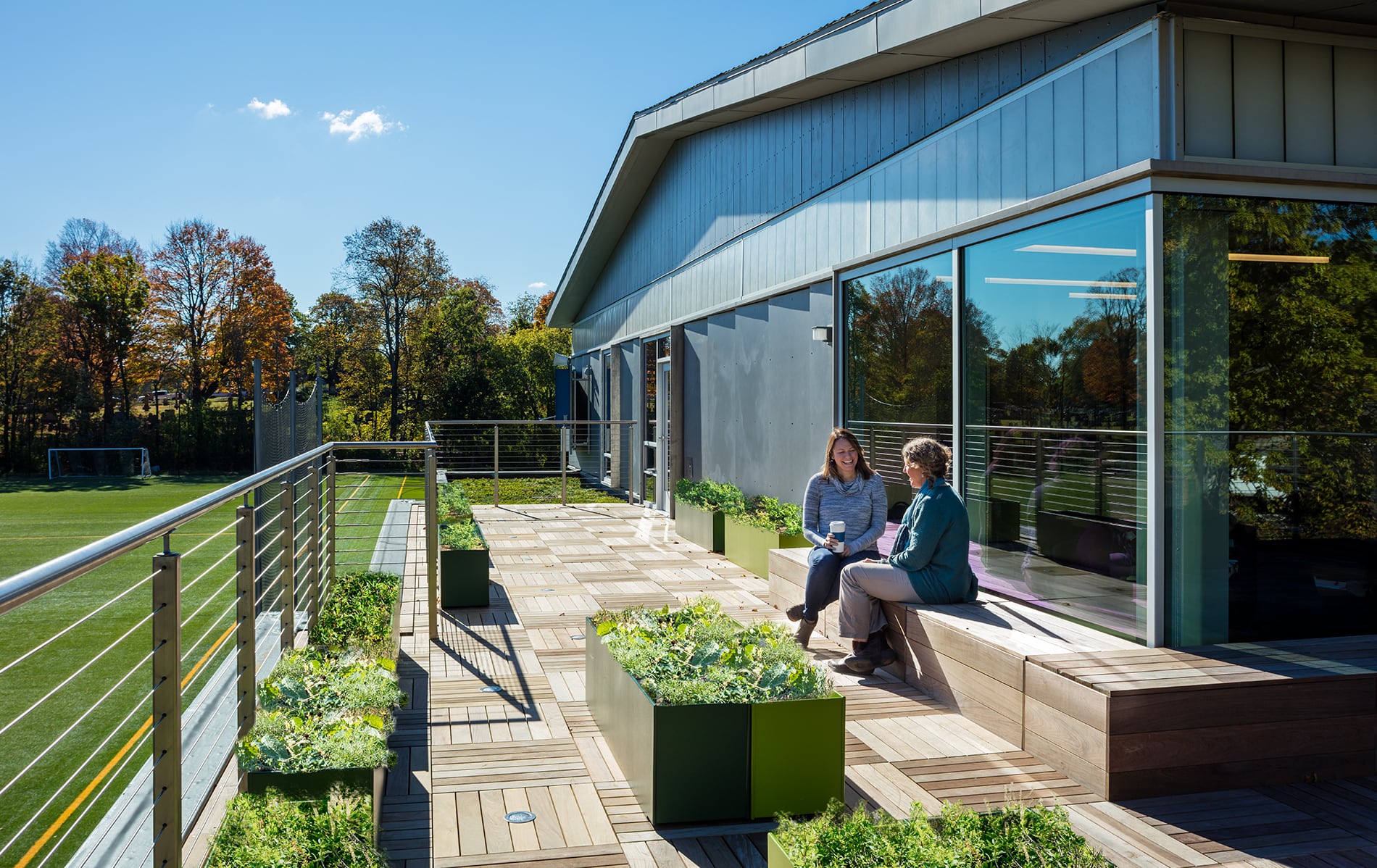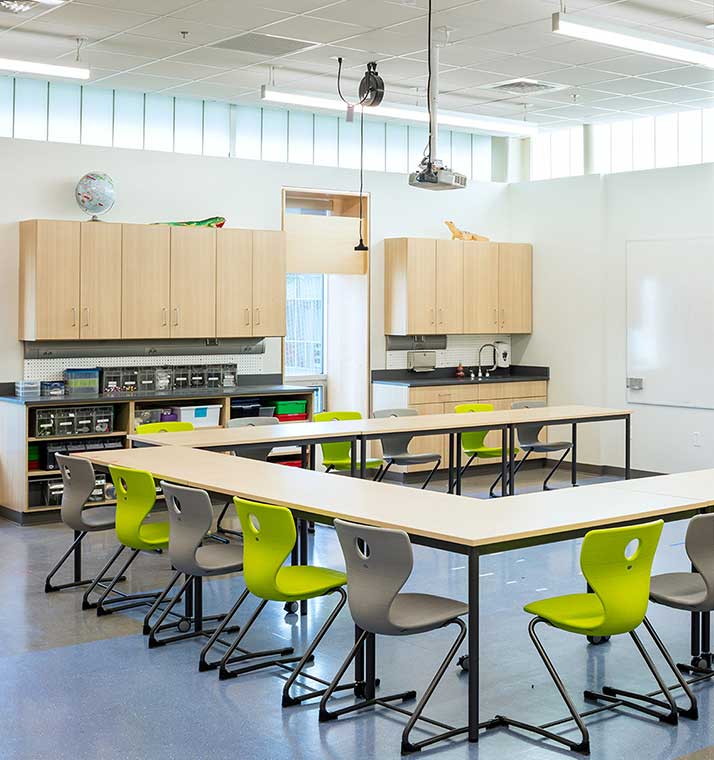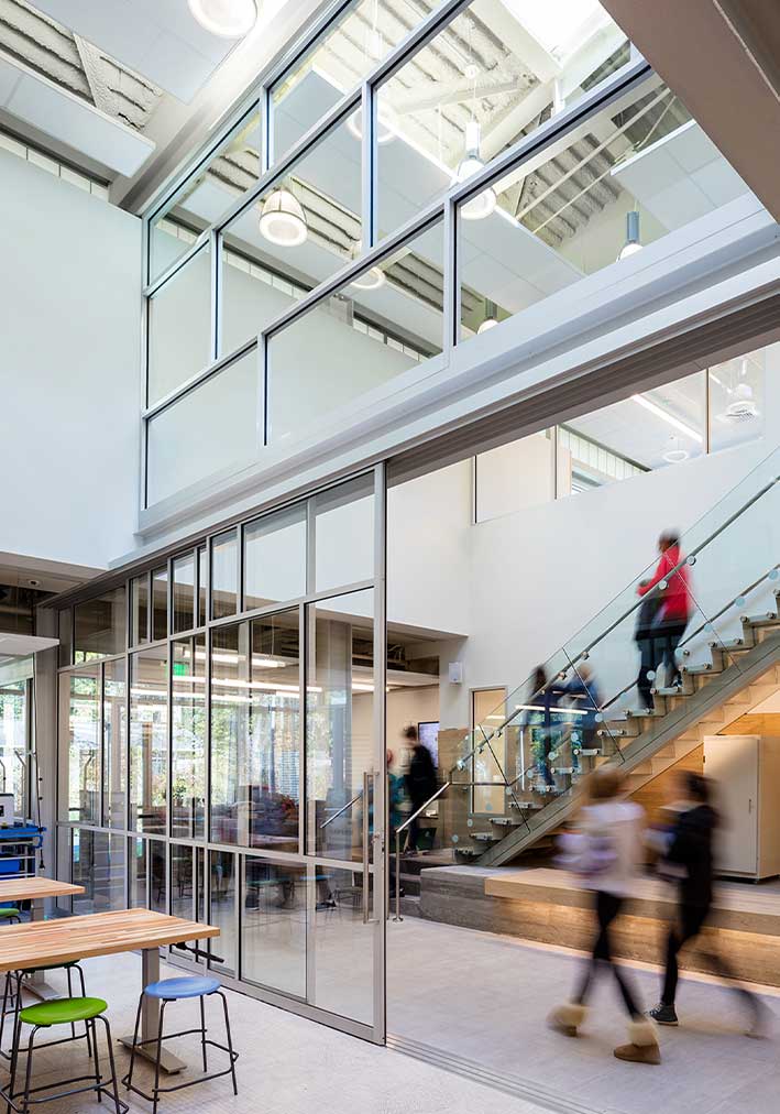 The design also includes an outdoor classroom and green roof, and its large, open interior spaces provide labs, classrooms, offices, and a large meeting/community venue. In addition, the project involved a cost-effective renovation of an existing gymnasium to meet the school’s budget and siting needs.